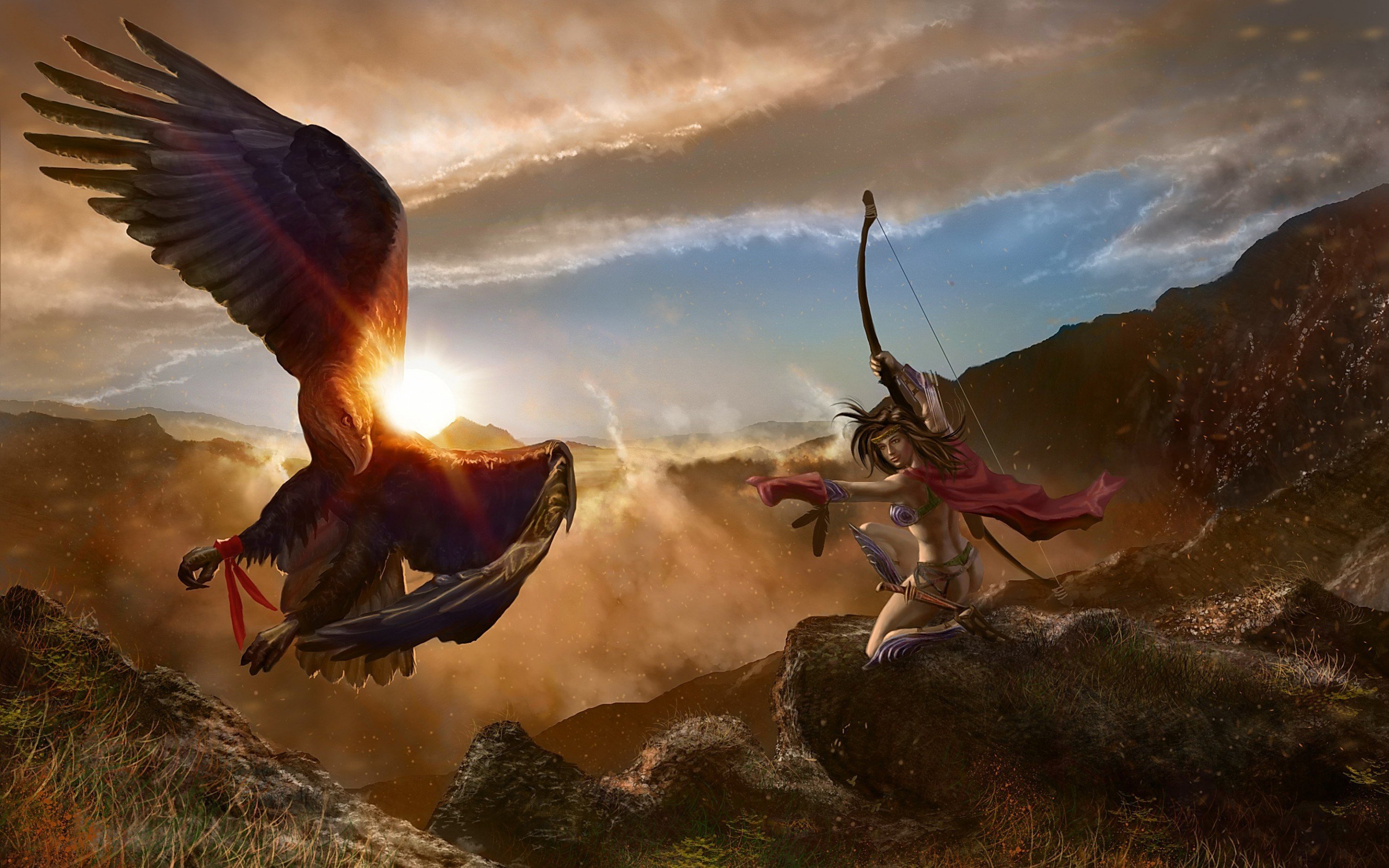 Description: A woman holding a sword and a bird in the air with a bird on her arm and a bird on her shoulder.
