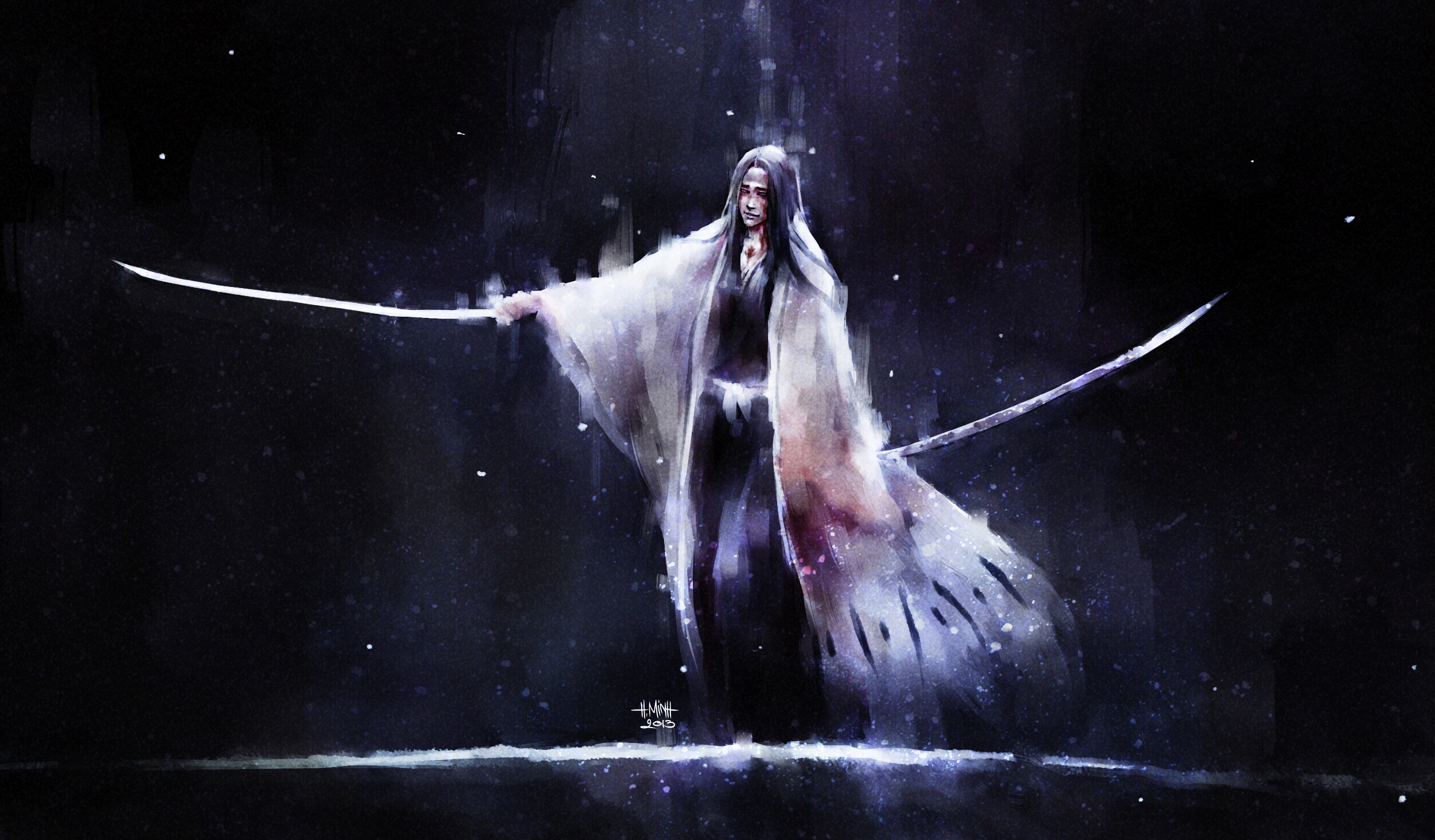 Description: A woman with a sword in her hand and a black background with stars and a sky with stars and a white cloud.
