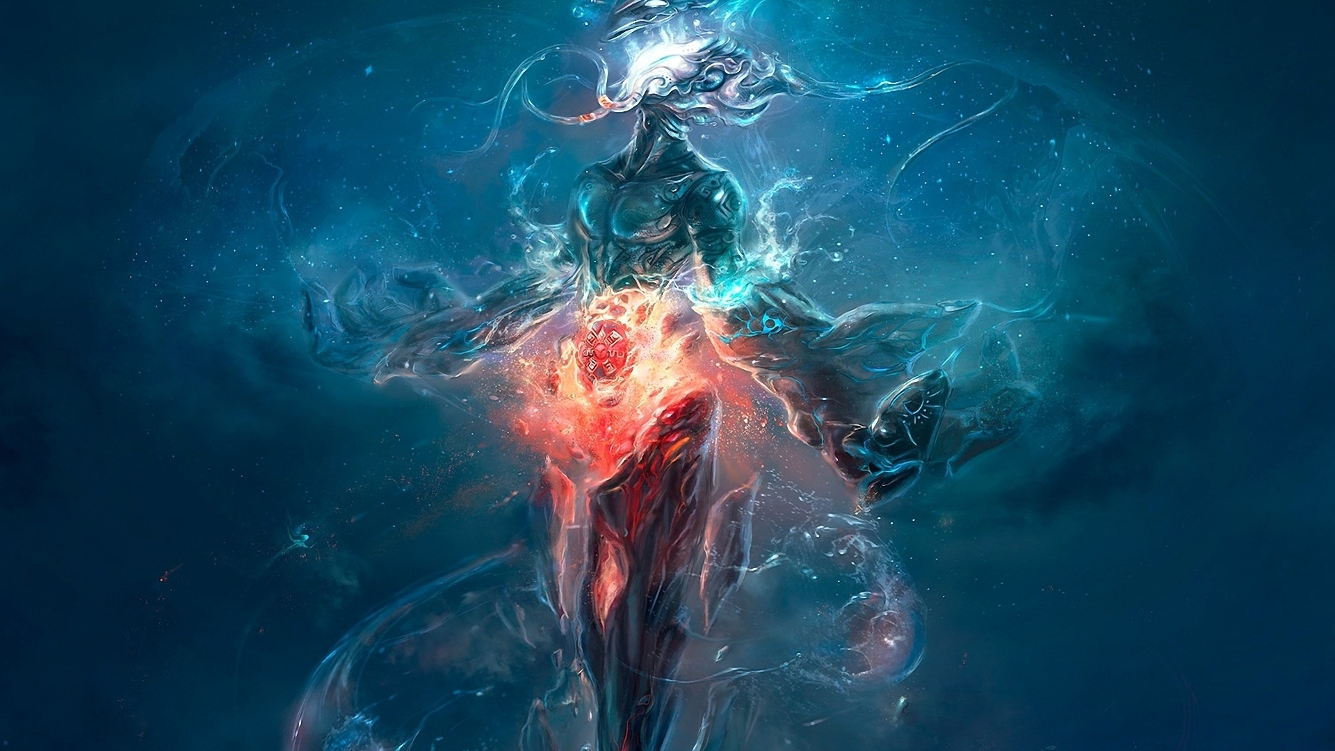 Description: A woman with a sword in a blue background with a red light in her hand and a blue light in her other hand.