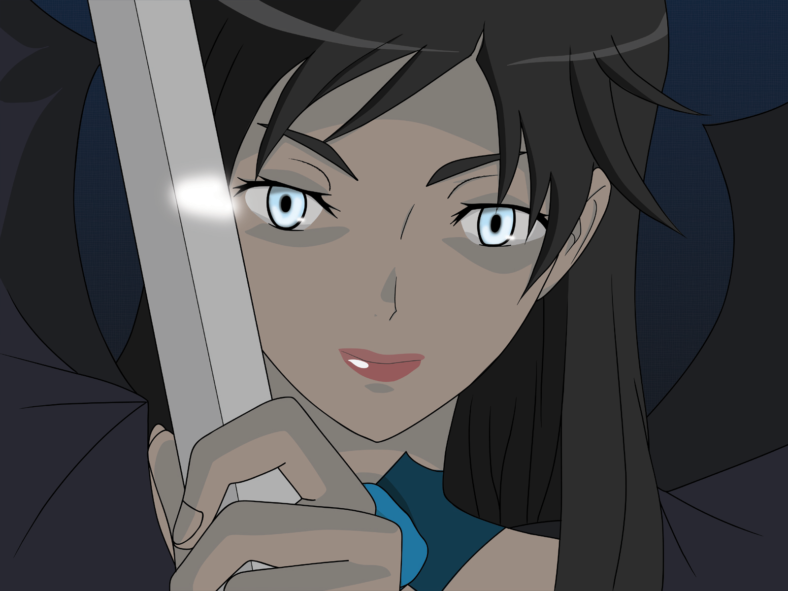 Description: A woman holding a sword in her hand with blue eyes and a smirk on her face.