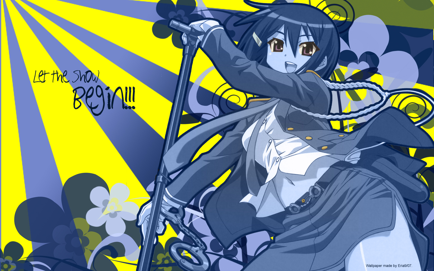 Description: A woman with a sword and a suit on holding a sword in her hand and a yellow background with flowers.