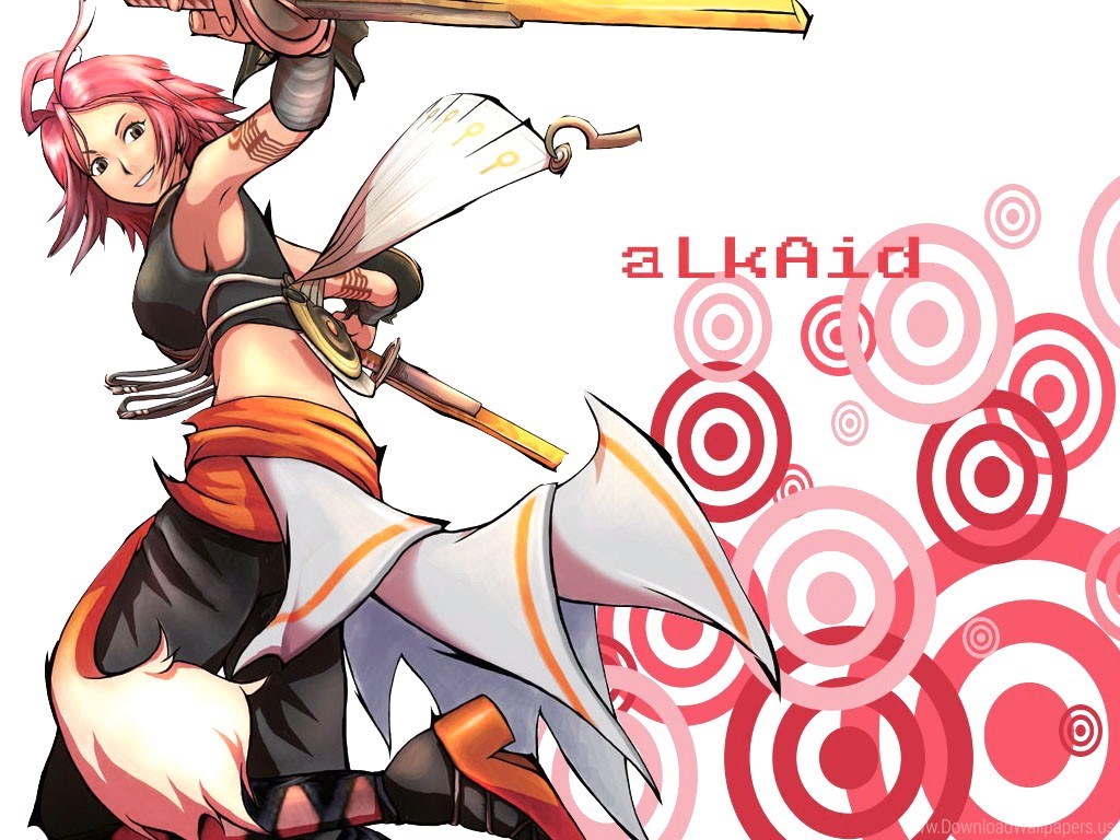 Description: A woman with a sword and a cat on her back with a red and white background and a red and white swirl.