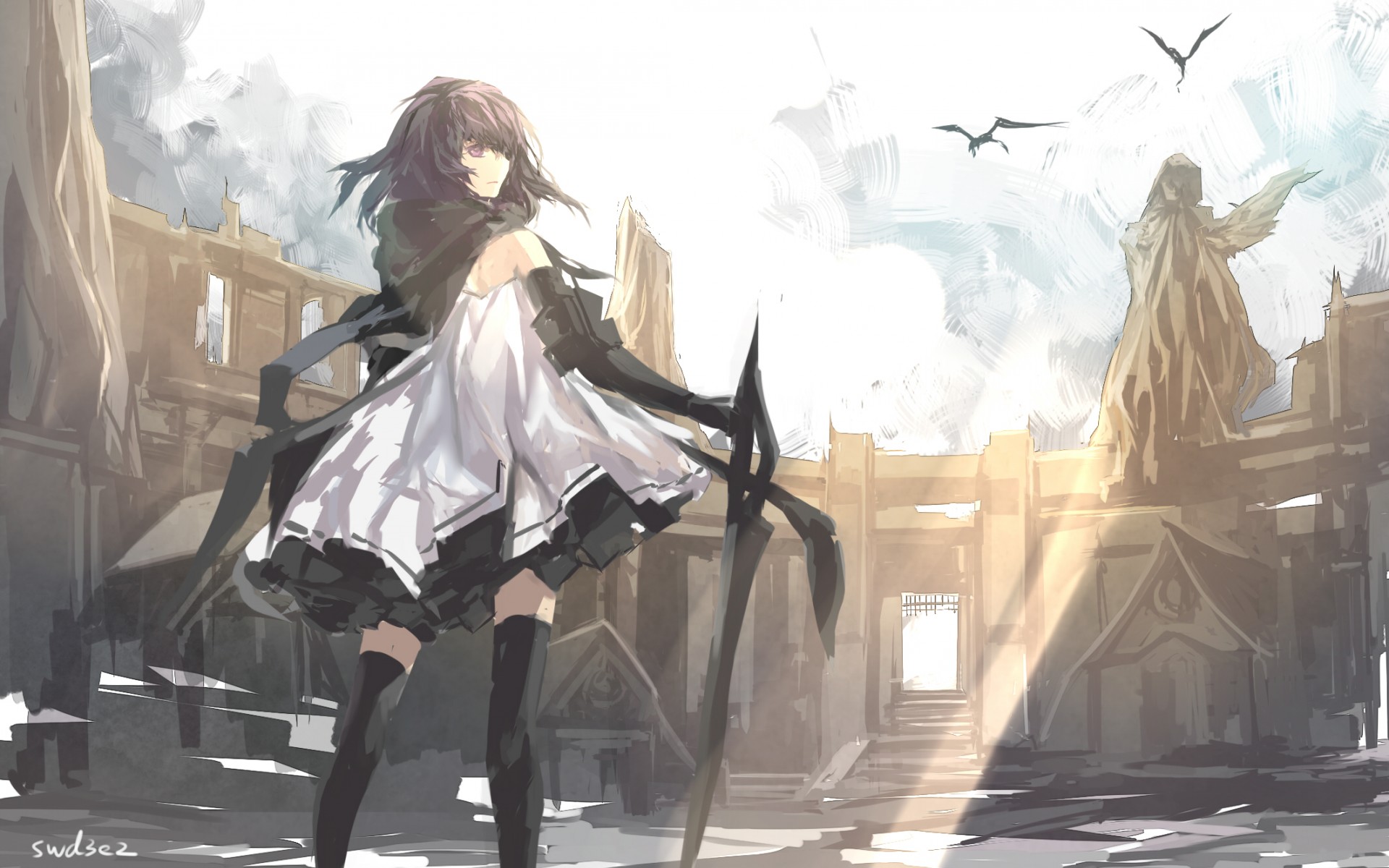 Description: A woman in a white dress holding a sword in a city street with a statue in the background and birds flying overhead.
