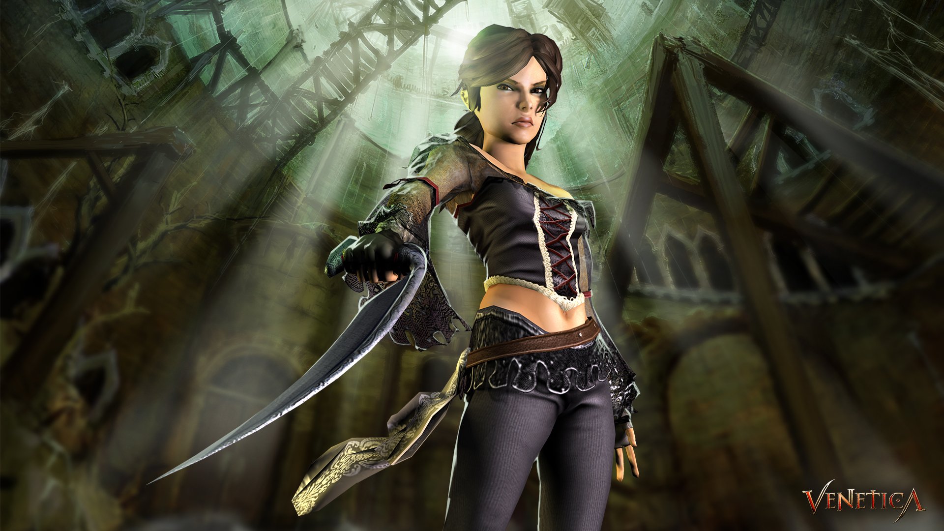 Description: A woman holding a sword and a sword in her hand in a dark room with a light coming from behind.