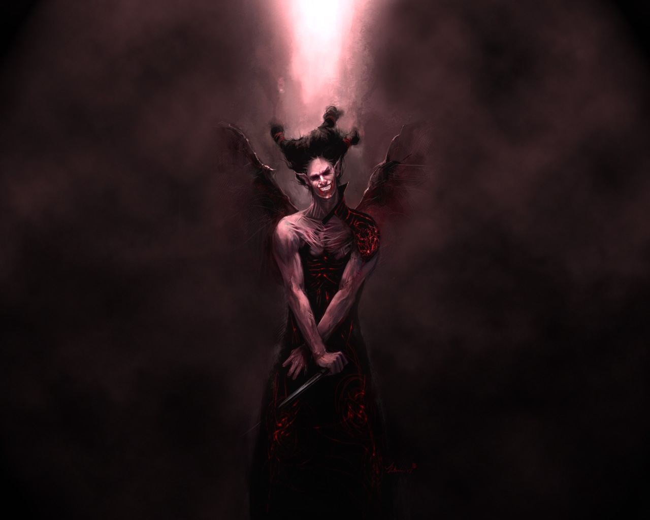 Description: A woman with a sword in her hands in a dark room with smoke and light coming from her head.