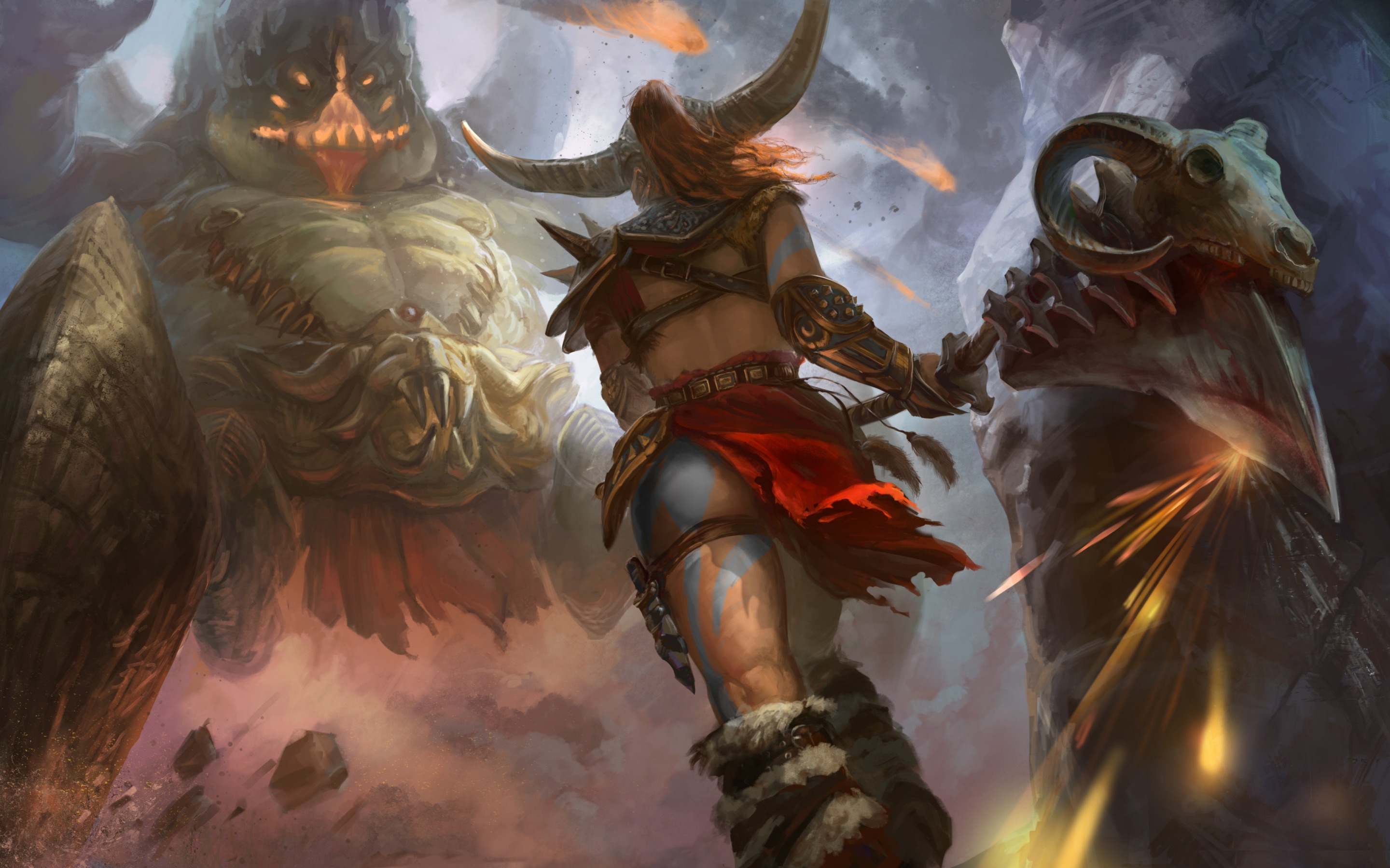 Description: A woman in a costume holding a sword next to a demon in a cave with a demon on it.