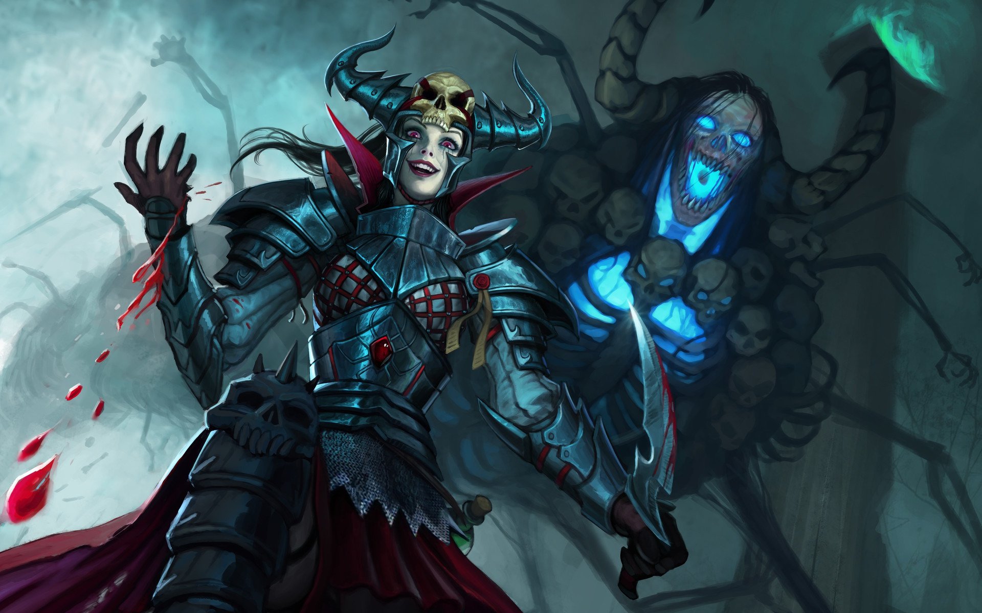 Description: A woman in a costume holding a sword and a demon with a demonish face on her face and a demon with a demonish face on her face.