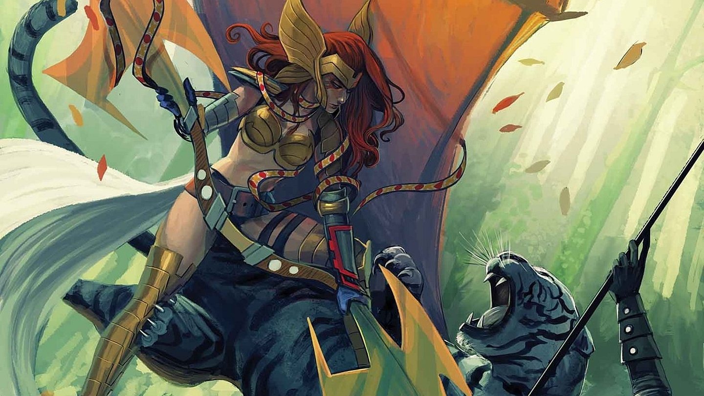 Description: A woman with a sword and a demon on her back in a forest with a giant orange flag and a cat.