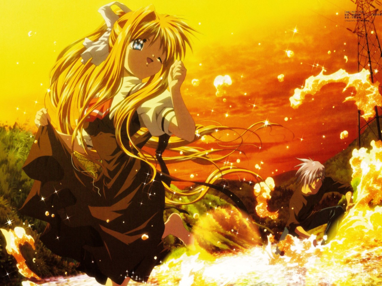 Description: A woman with long hair and a sword in a field of fire and water with a yellow sky behind her.