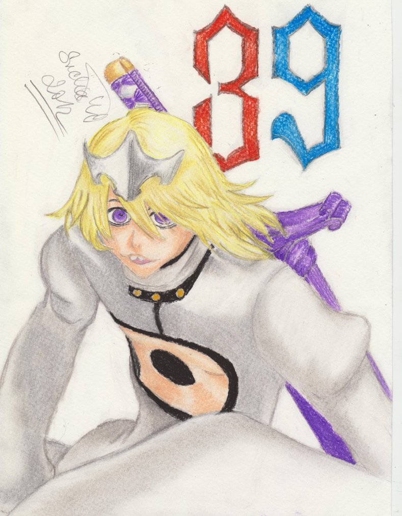 Description: A drawing of a woman with a sword and a number nine on it's back and a name on her chest.