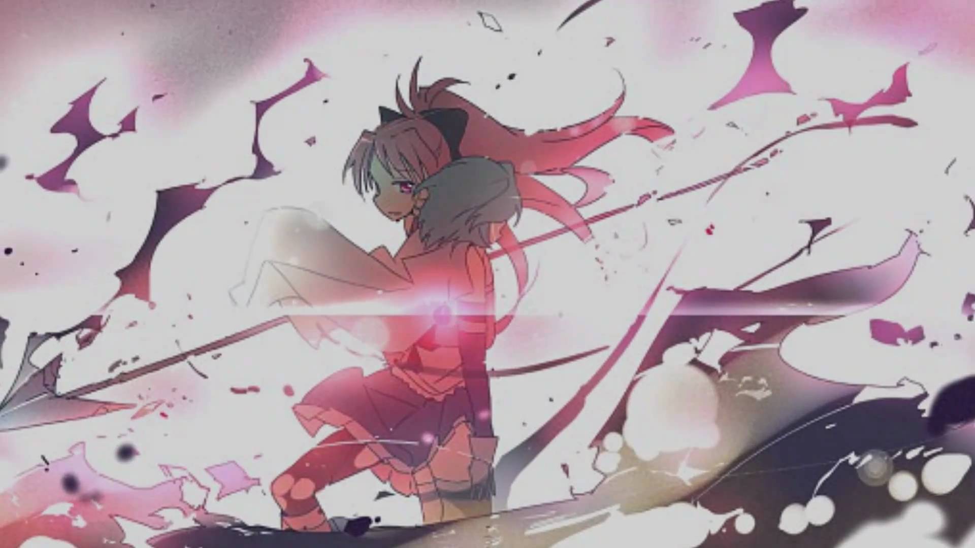 Description: A woman with a sword standing in front of a purple background with stars and swirls on it.