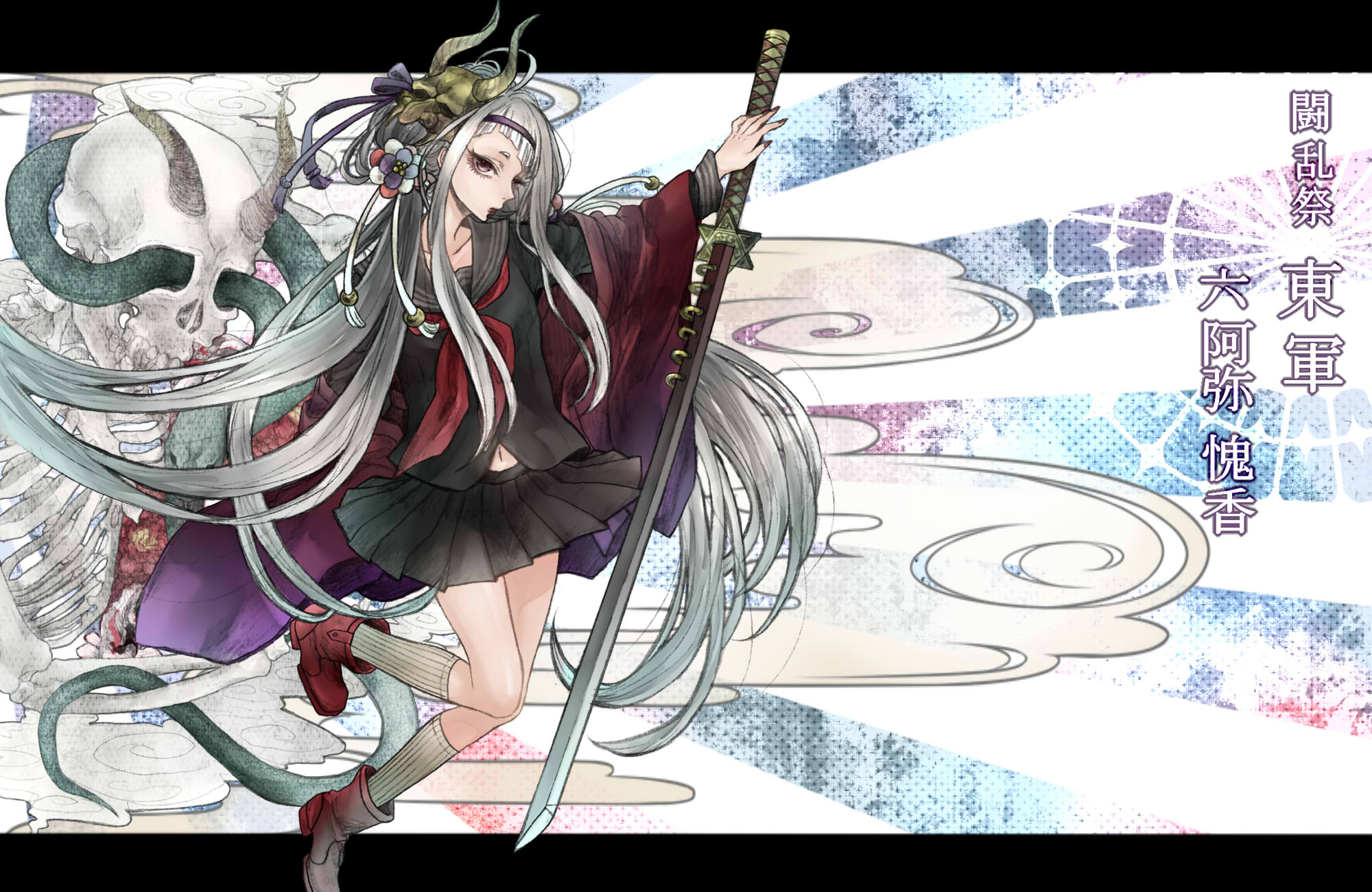Description: A woman with a sword and a skull on her back is standing in front of a white background with a blue and pink design.