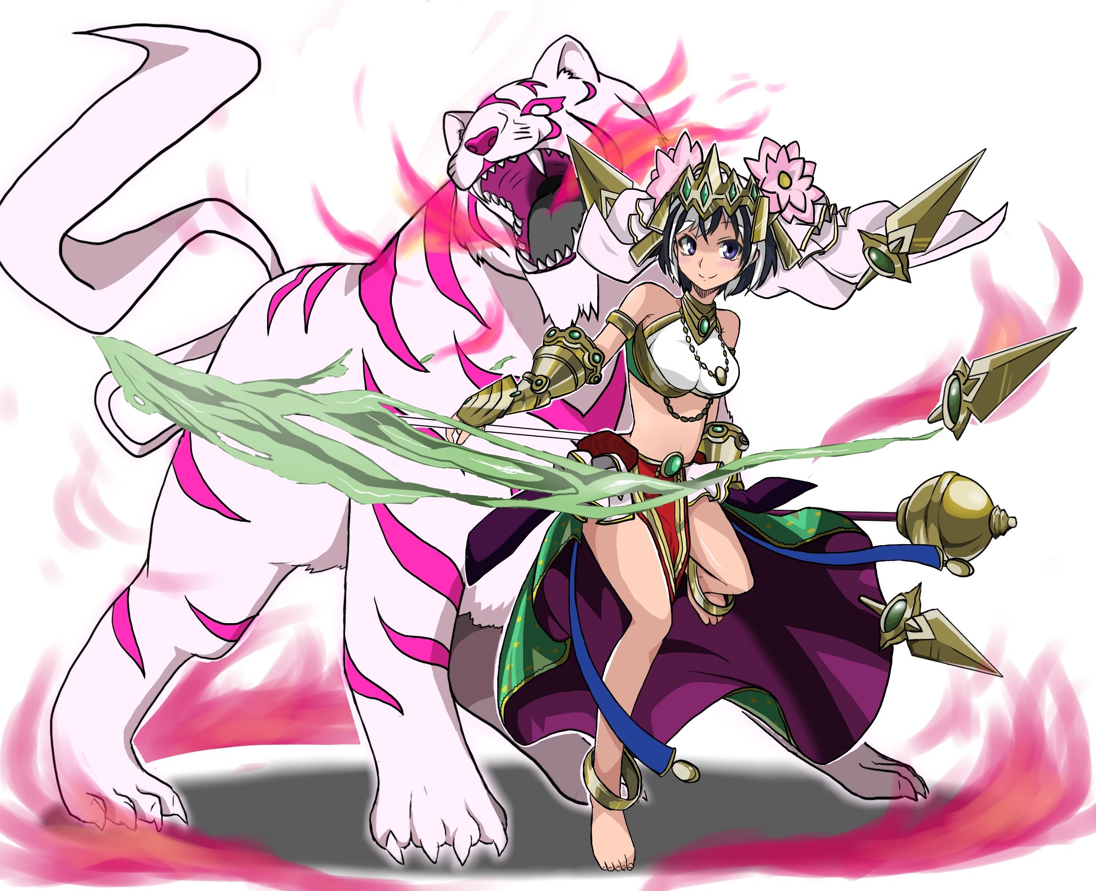 Description: A woman in a costume holding a sword next to a white tiger with pink and green hair and a green tail.