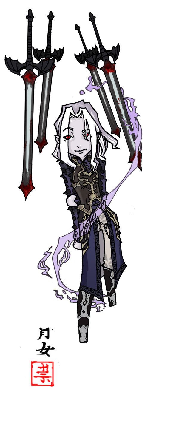 Description: A drawing of a woman holding two swords in her hand and a chinese character in the background with a red and white background.
