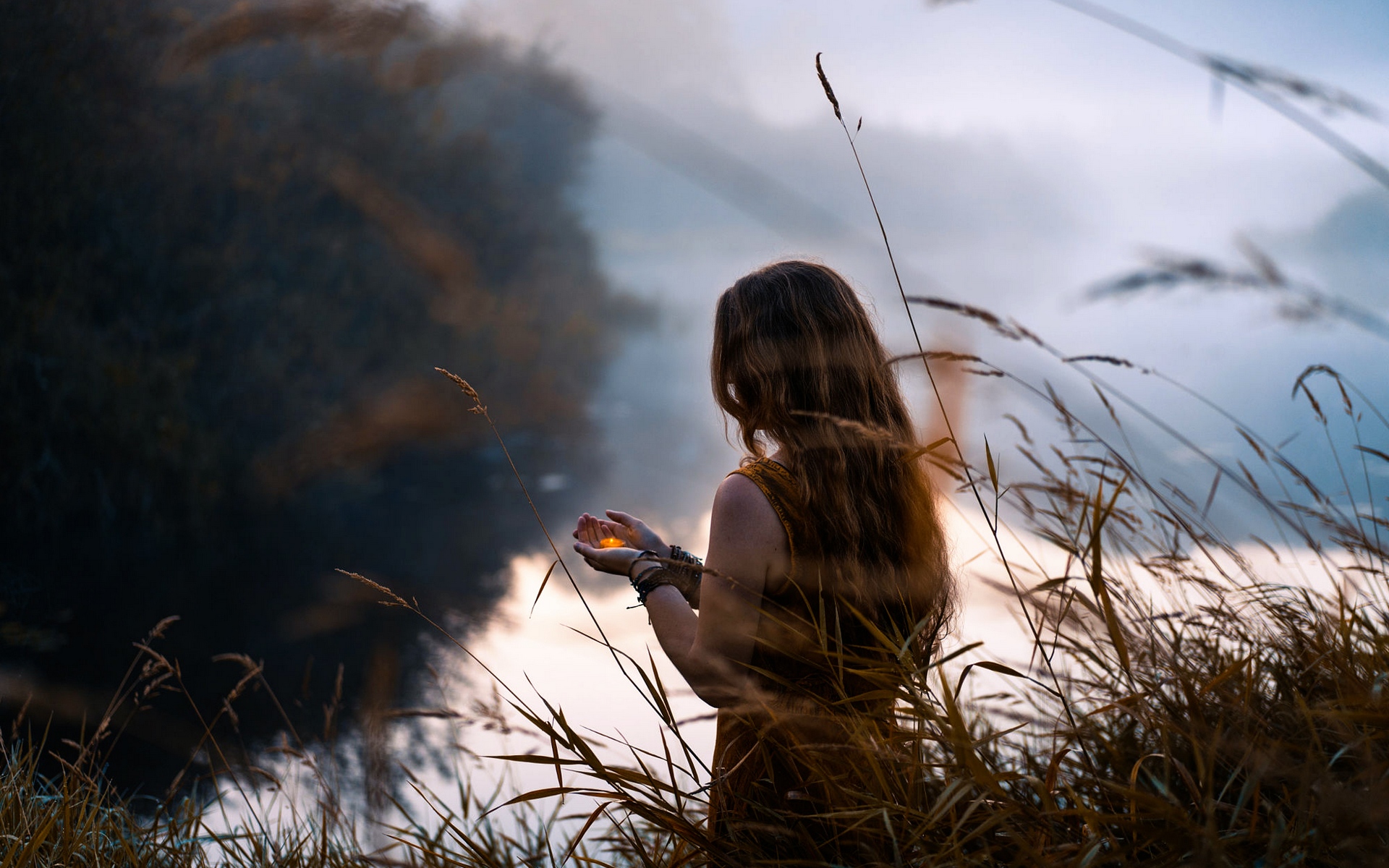 Description: A woman standing in tall grass holding a cell phone in her hand and looking at the water behind her.