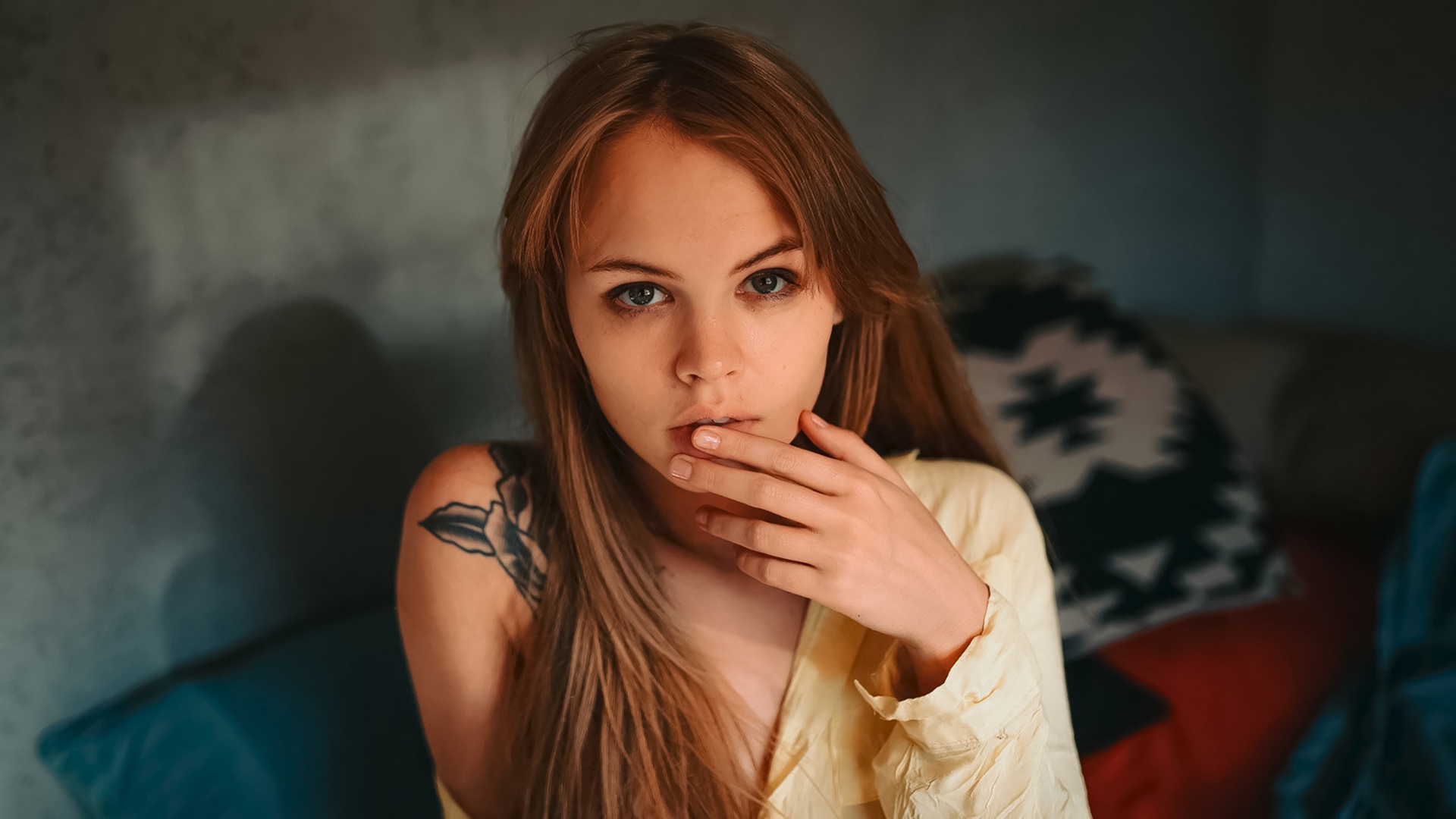 Description: A woman with a tattoo on her arm posing for a picture with her hand on her face and her hand on her chin.