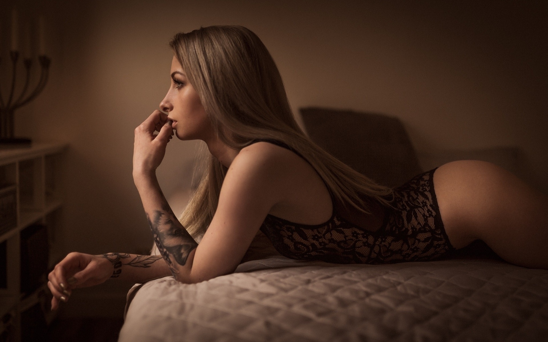 Description: A woman laying on a bed with a tattoo on her arm and leg.