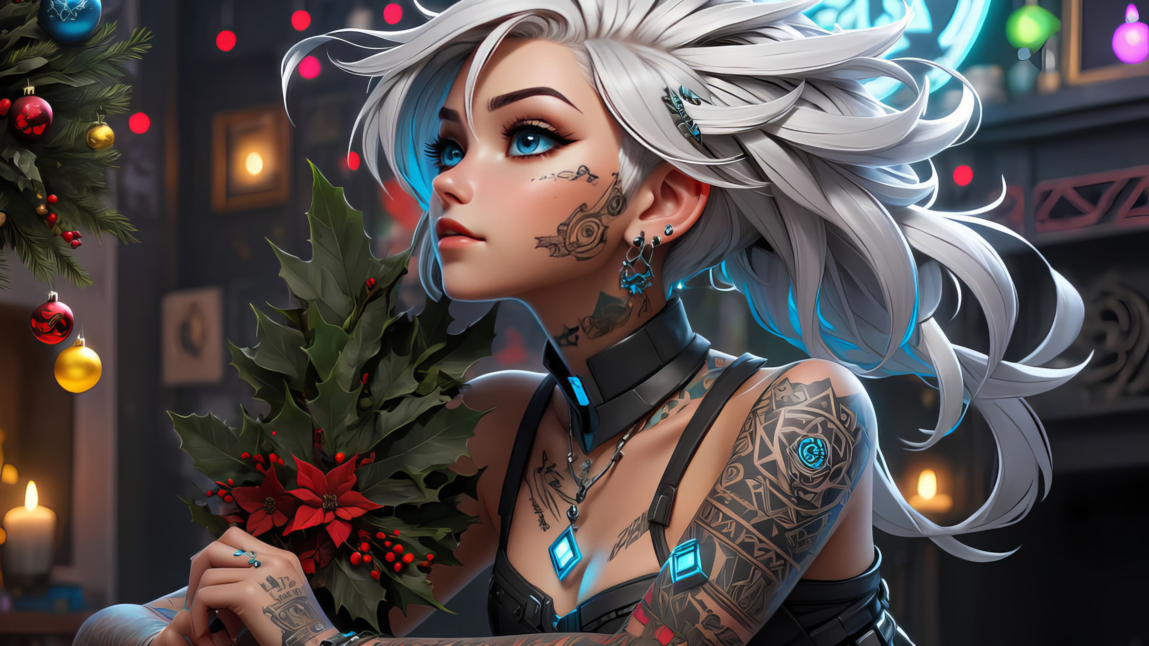 Description: A woman with tattoos holding a christmas wreath and a poinsettia plant in her hand.