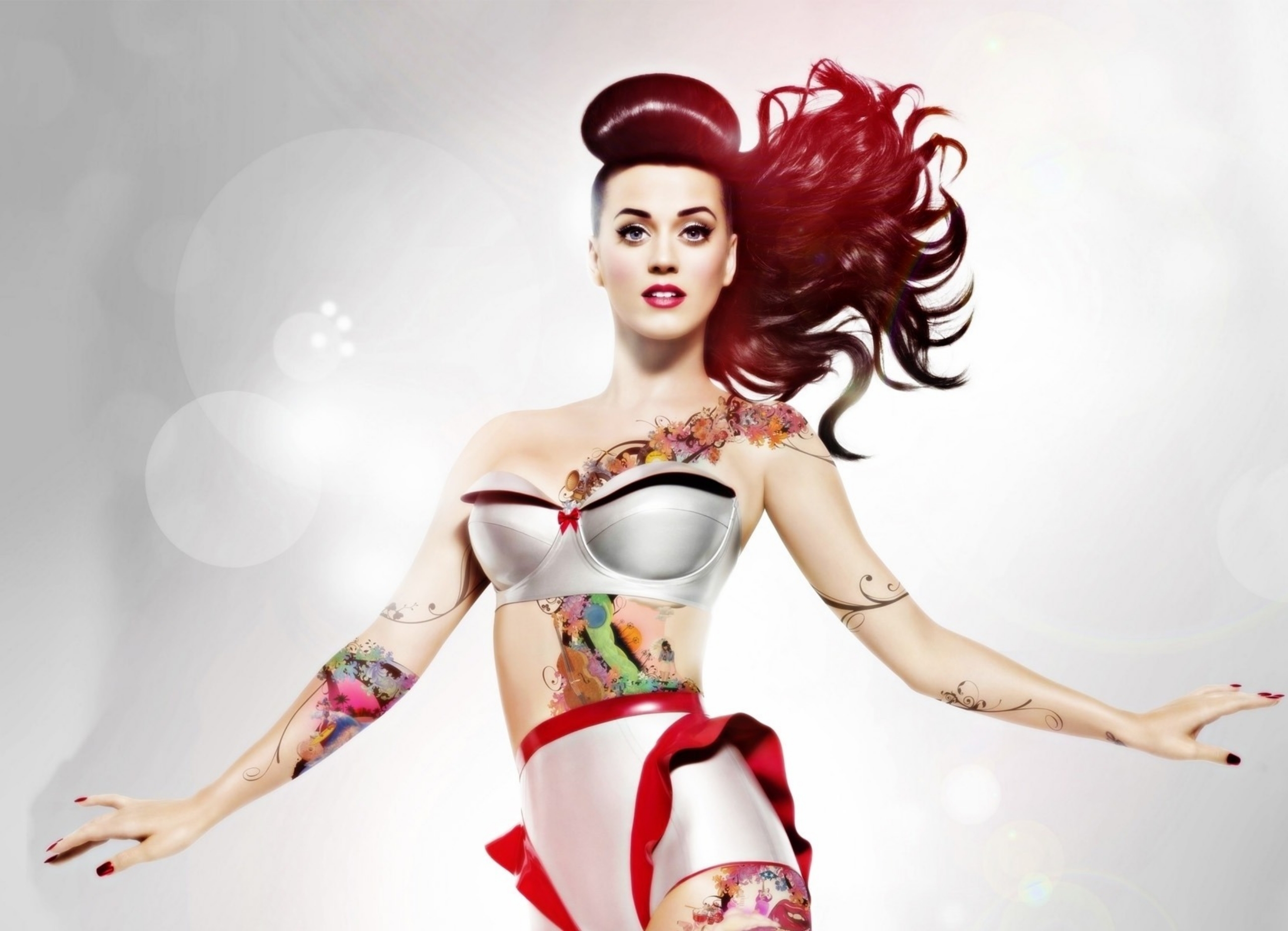 Description: A woman with tattoos and a white top and red skirt is dancing with her arms outstretched in the air.