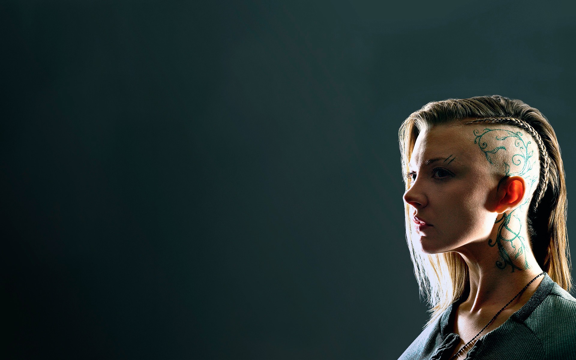 Description: A woman with a tattoo on her face and ear piercings on her head and neck.
