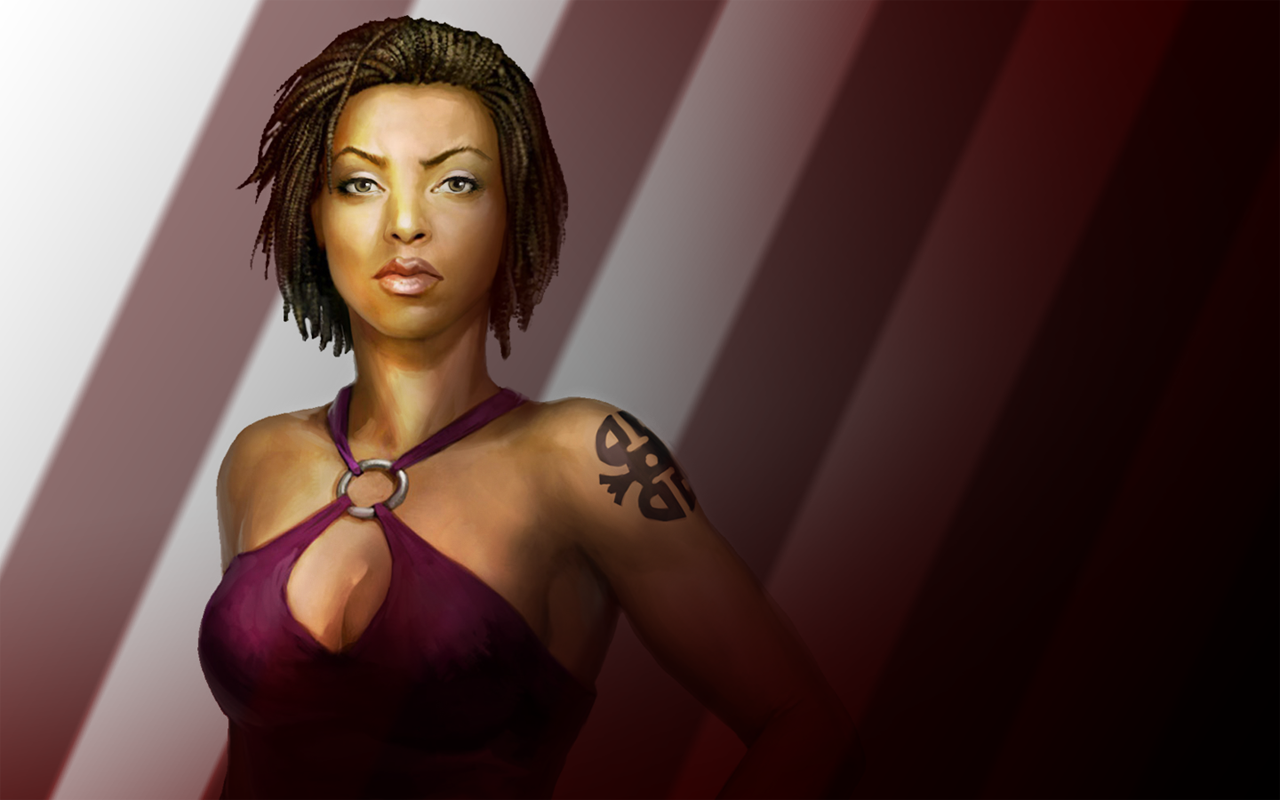 Description: A woman with a tattoo on her arm and chest wearing a purple top and a cross necklace on her neck.