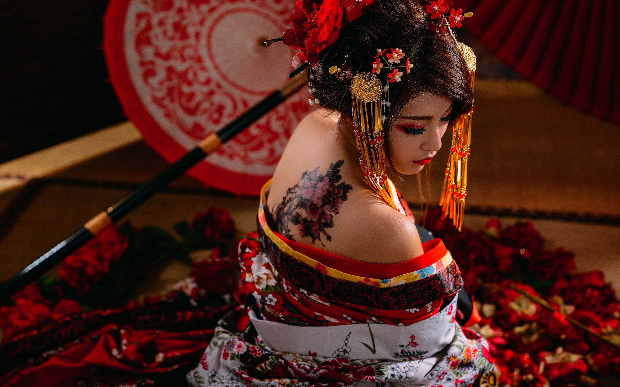 Description: A woman with a tattoo on her back and a red umbrella behind her back.