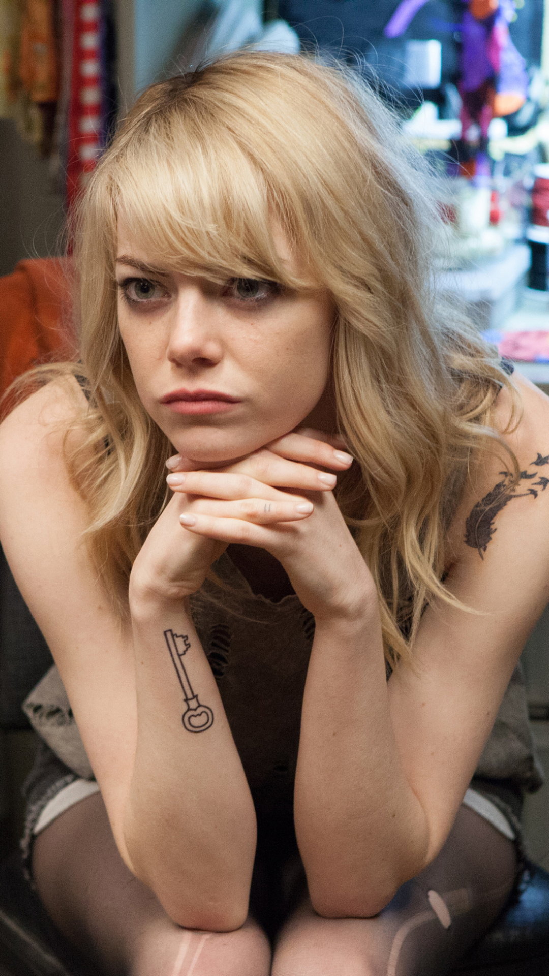 Description: A woman with a tattoo on her arm sitting down with her hand on her chin and her hand on her chin.