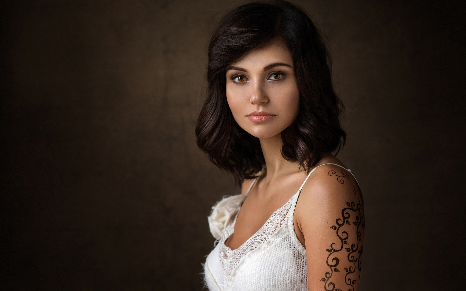 Description: A woman with a tattoo on her arm posing for a picture in a white dress with a black background.