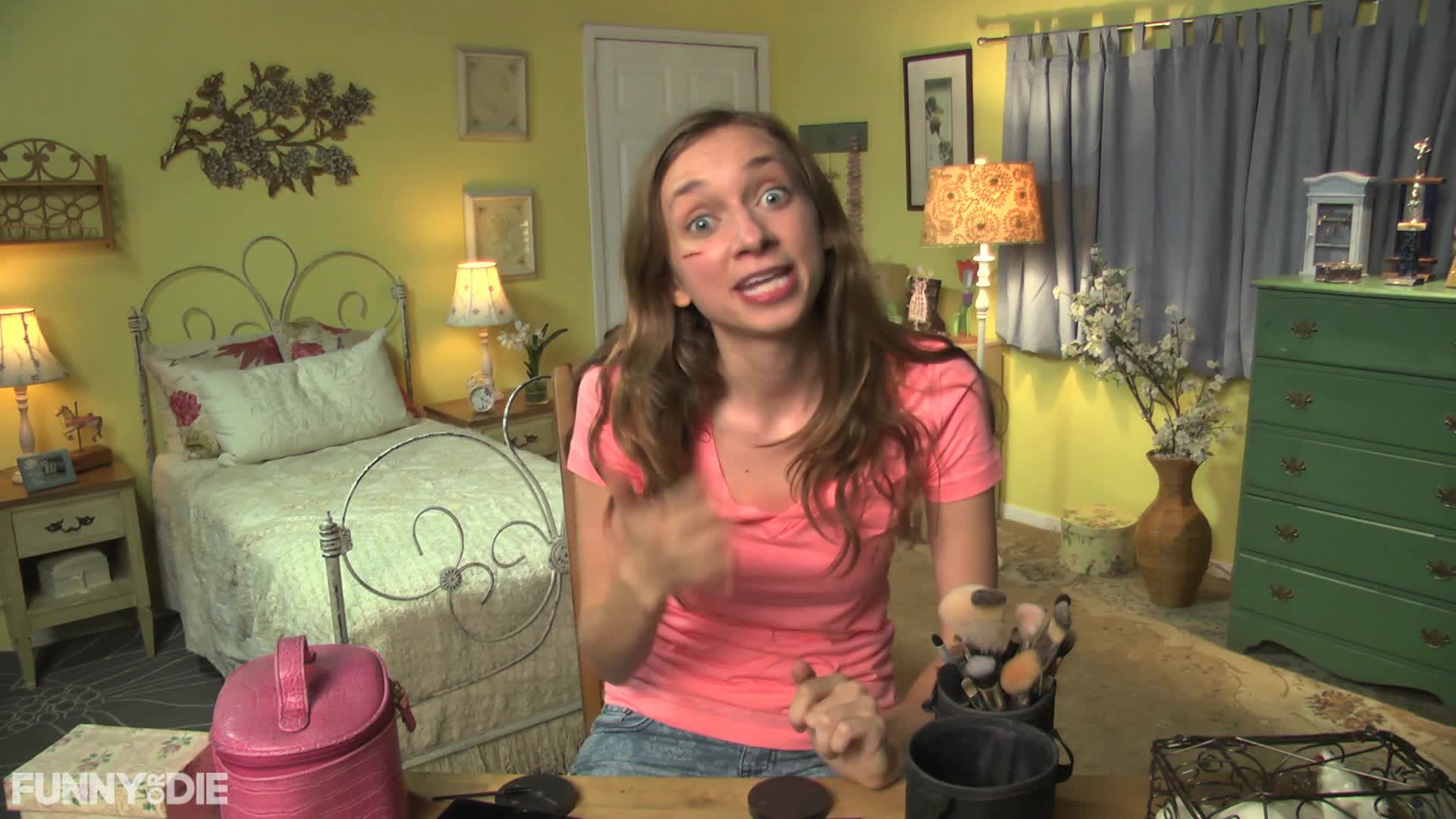Description: A woman is making a face while holding a teddy bear in a bedroom with a bed and dressers.