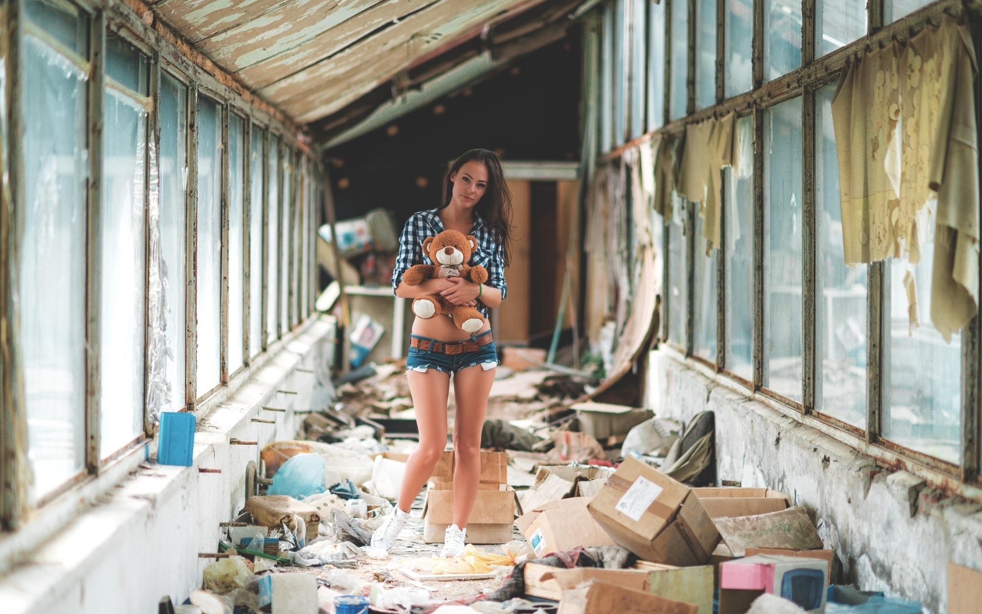 Description: A woman holding a teddy bear in a room full of junk and junked out windows and windows on the side of the building.