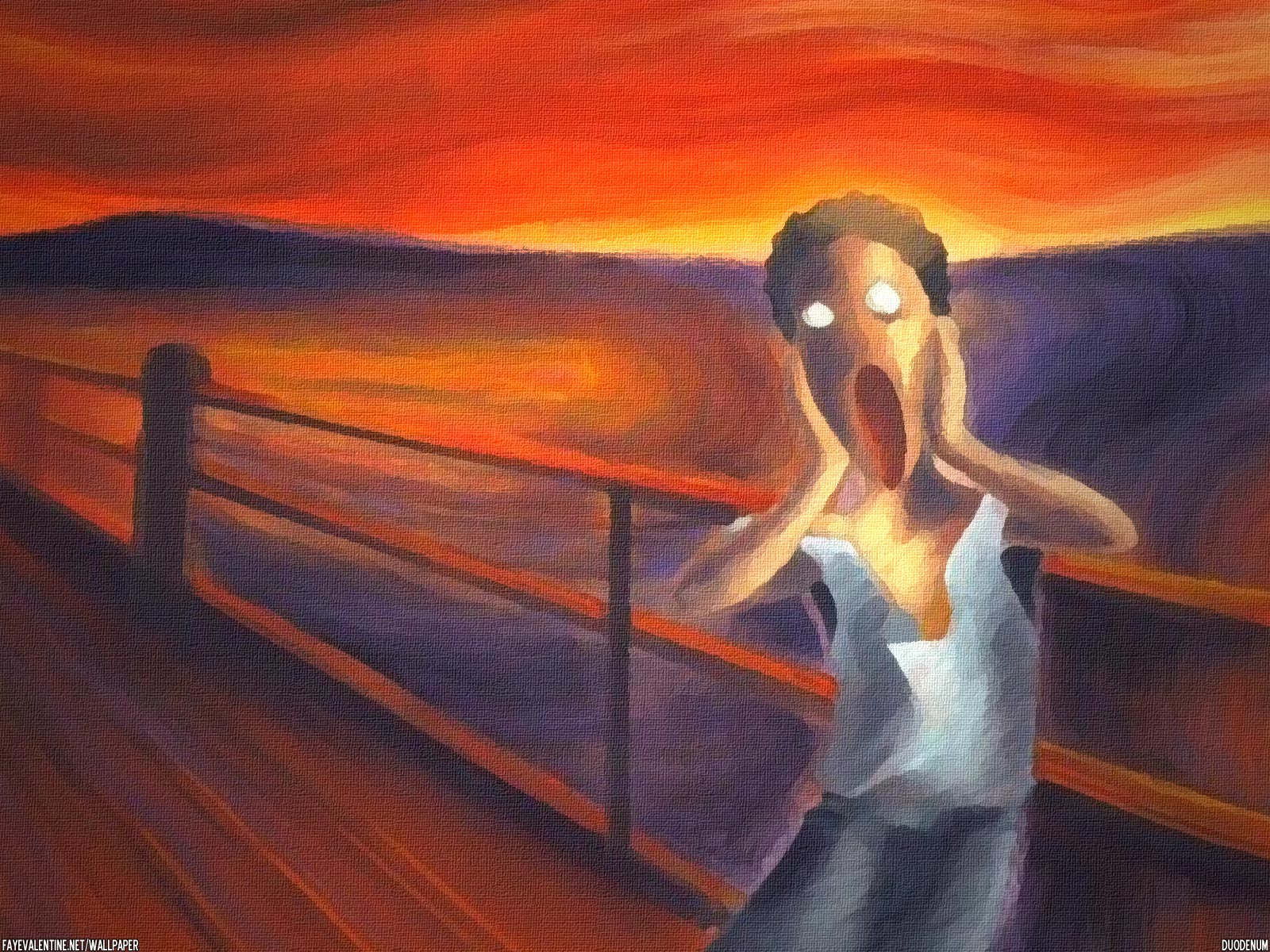 Description: A painting of a woman looking through a telescope at a sunset over a body of water with a red sky.