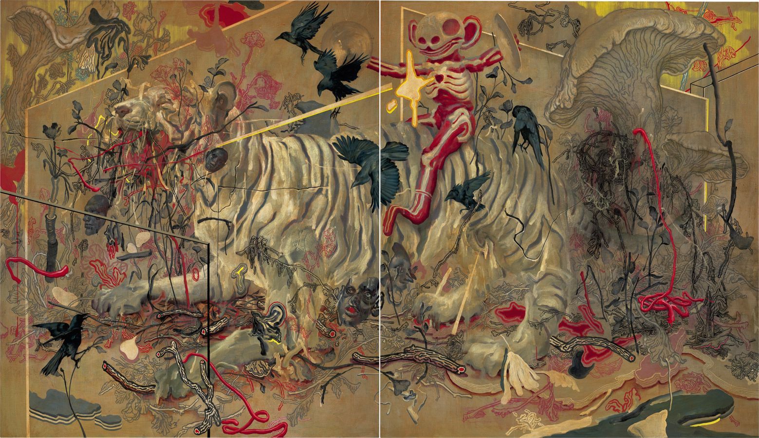 Description: A painting of a woman on a tiger with a sword and a bird flying over her head and a bird on her shoulder.