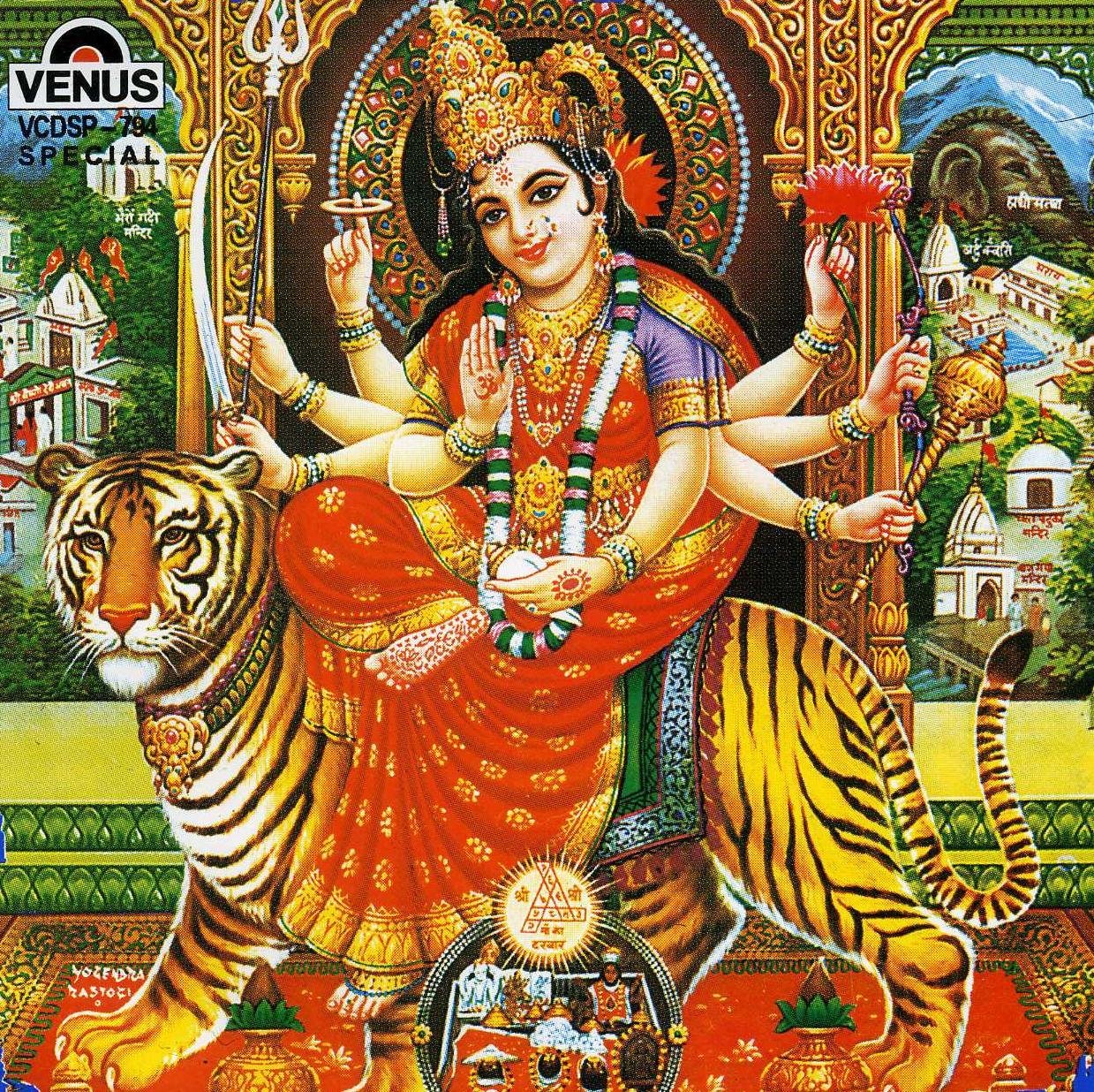 Description: A painting of a woman sitting on a tiger with a sword in her hand and a tiger in the foreground.