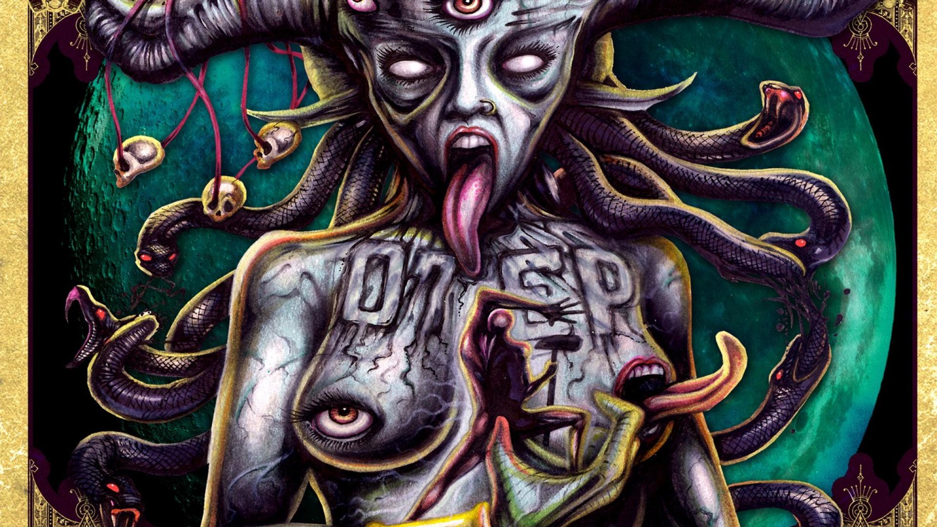 Description: A painting of a woman with her tongue out and a demon on her chest with a snake on her chest.