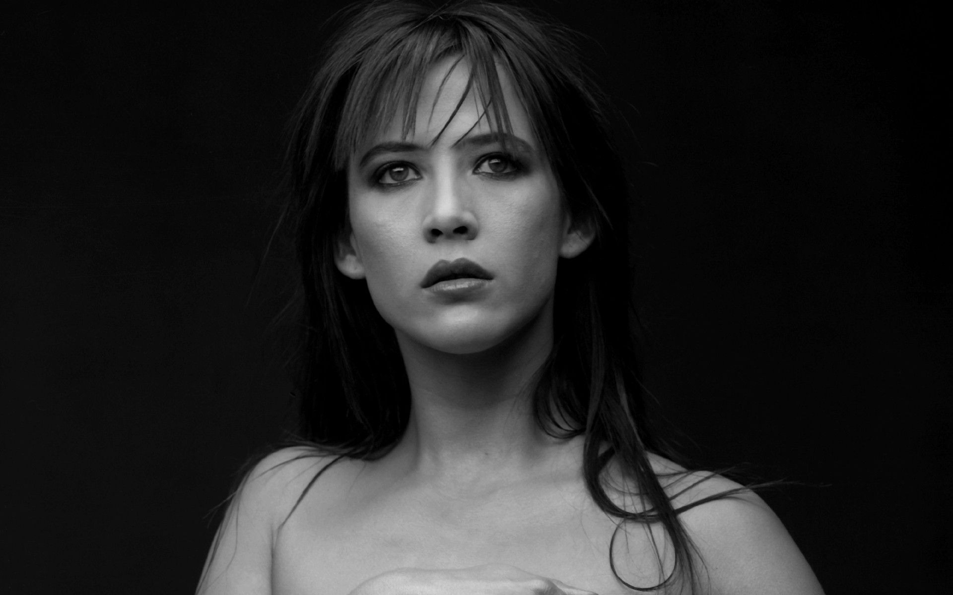 Description: A woman with a towel around her neck posing for a picture in a black and white photo with a black background.