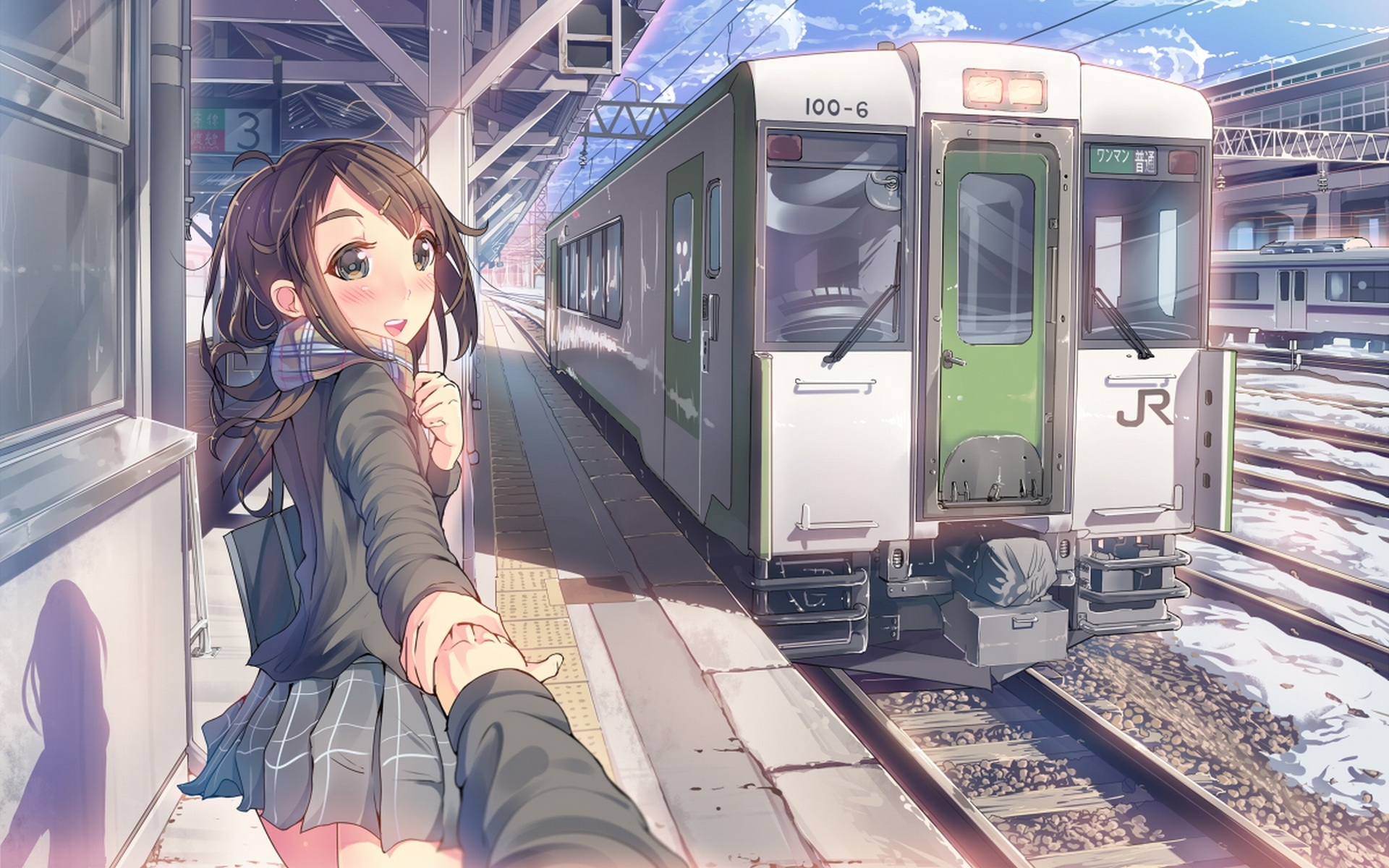 Description: A woman is sitting on a train platform and looking at a train passing by her.