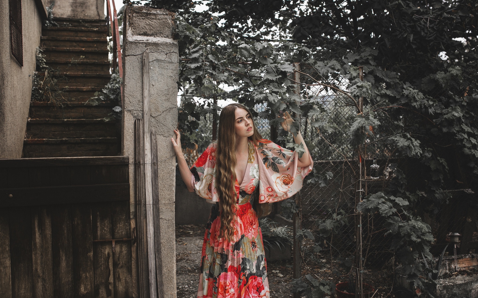 Description: A woman in a long dress standing next to a tree and a fence with a bird on it's shoulder.