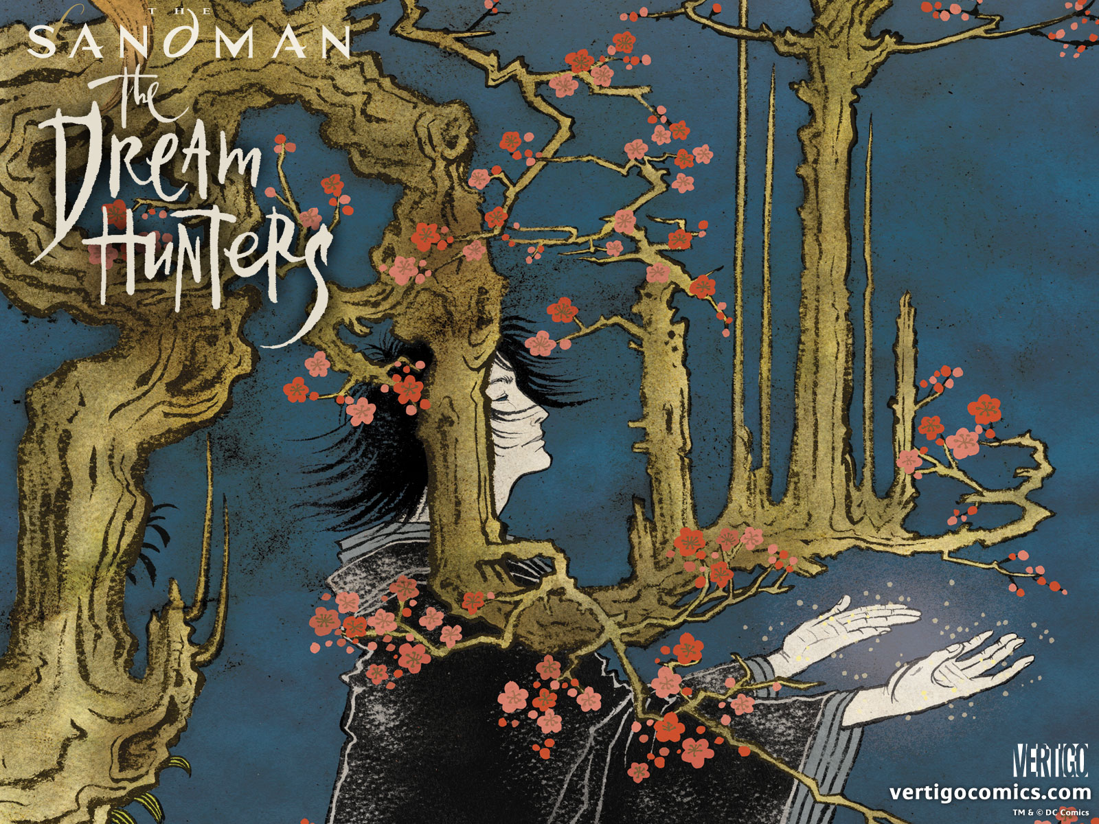 Description: A woman is standing in front of a tree with flowers on it and a bird flying over her head.