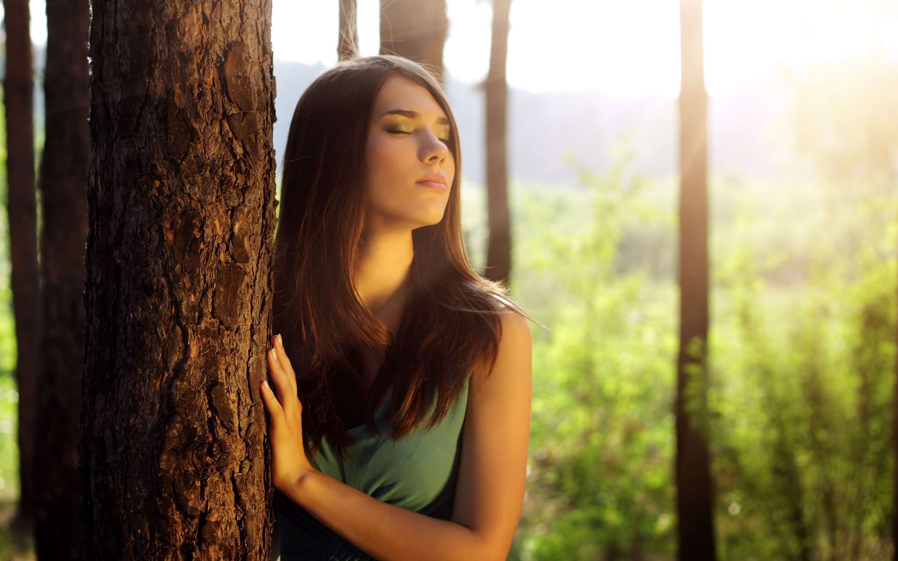 Description: A woman standing next to a tree in a forest with her eyes closed and her hands on the tree.