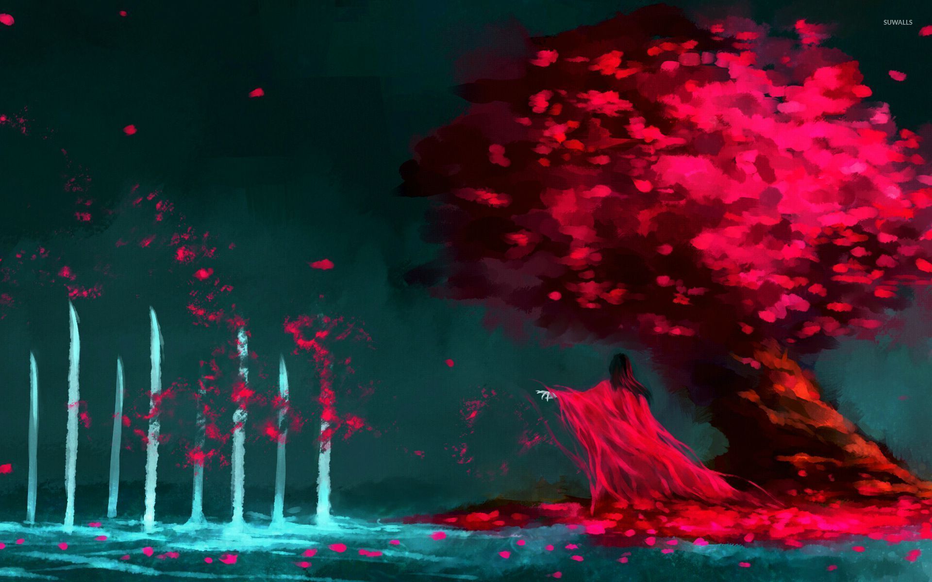 Description: A painting of a woman standing under a tree with red leaves on it and a lot of candles in the background.