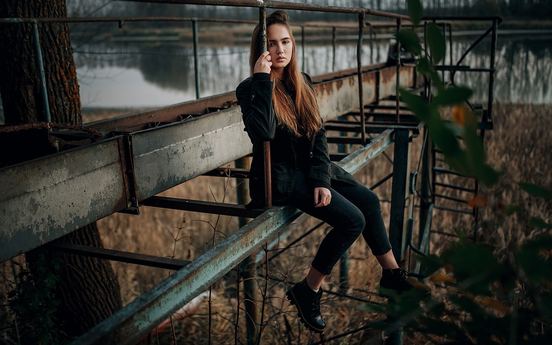 Description: A woman sitting on a metal rail next to a tree and water in the background.