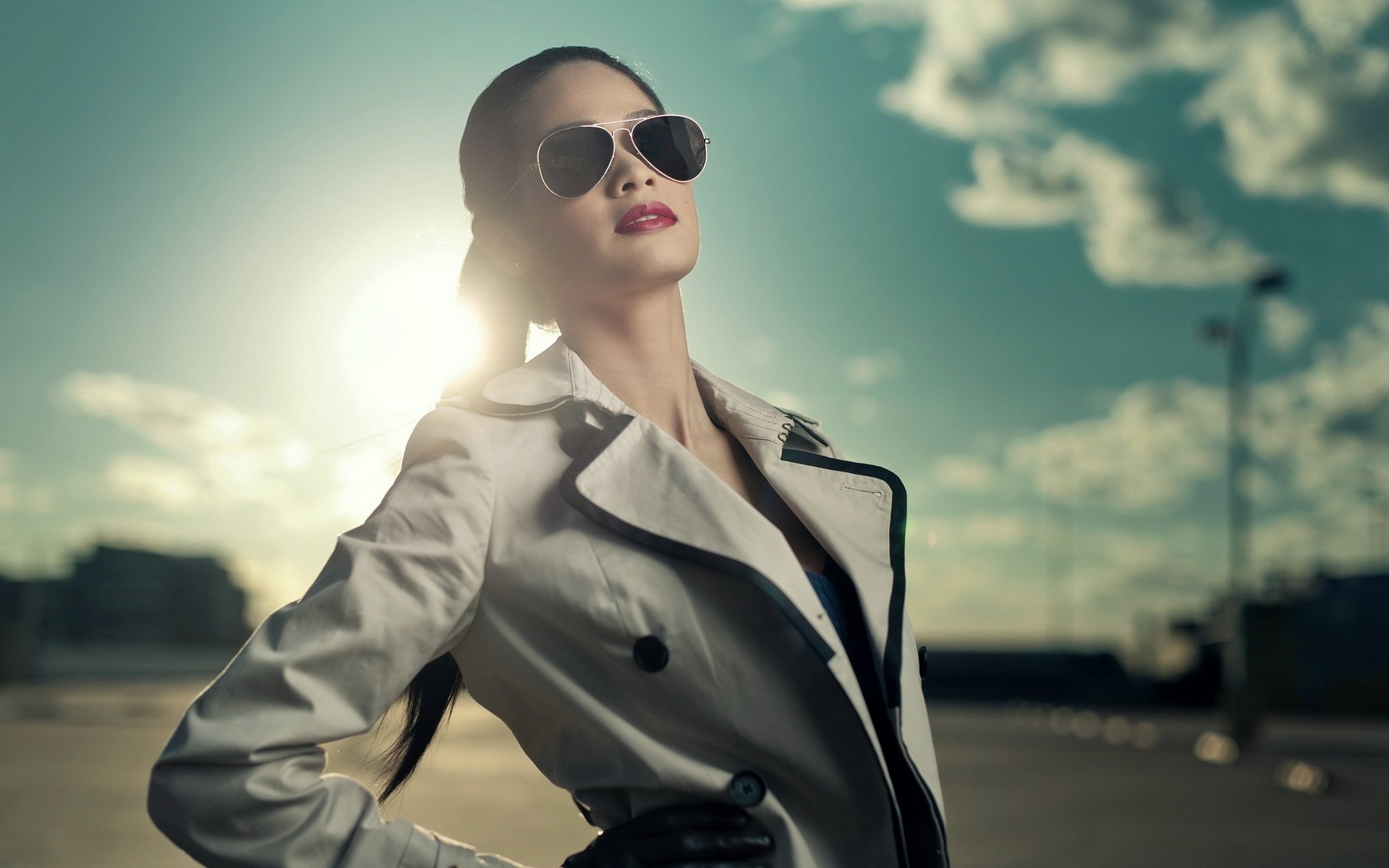 Description: A woman in a trench coat and sunglasses posing for a picture with the sun behind her and clouds in the sky.