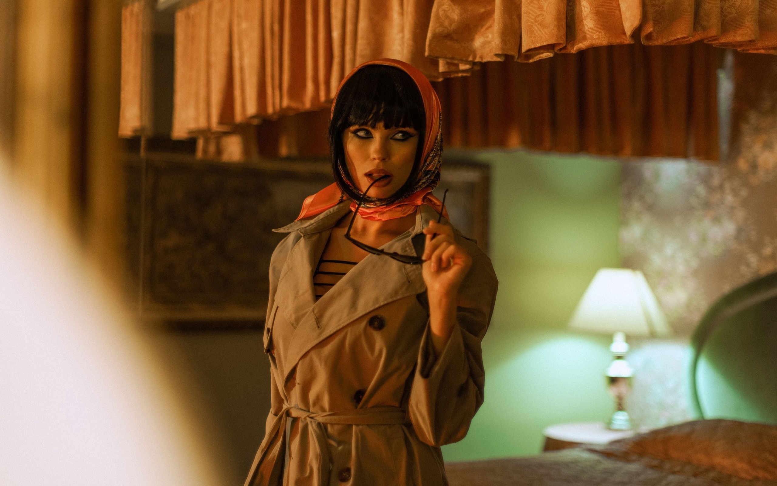 Description: A woman in a trench coat standing in a bedroom with a lamp on the side of the bed and a window.