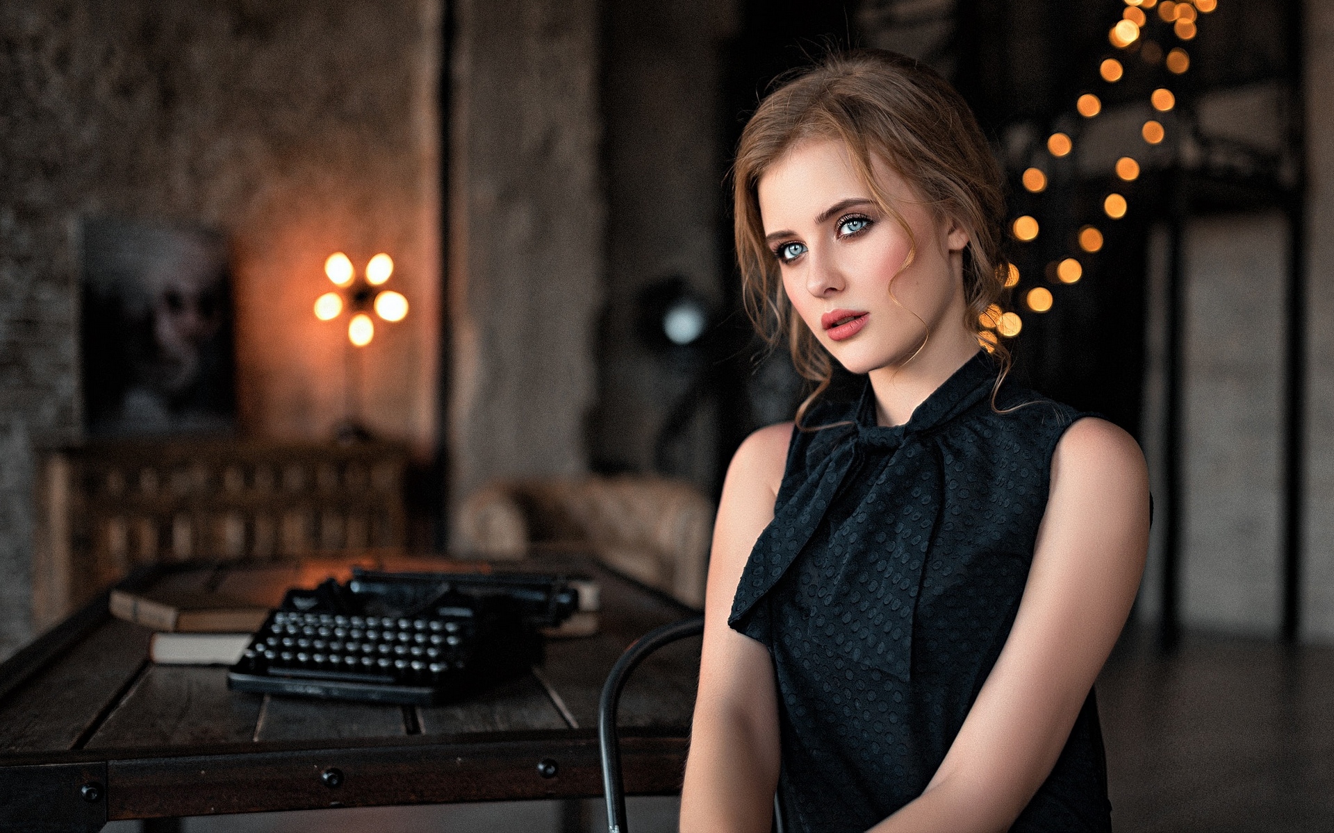 Description: A woman sitting at a table with a typewriter in front of her and a lit up background behind her.