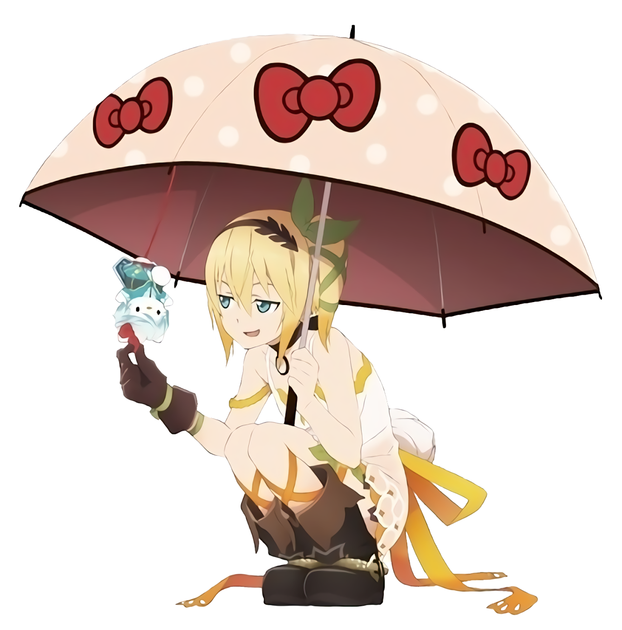 Description: A woman holding an umbrella with a cat on it's side and a mouse in her hand.