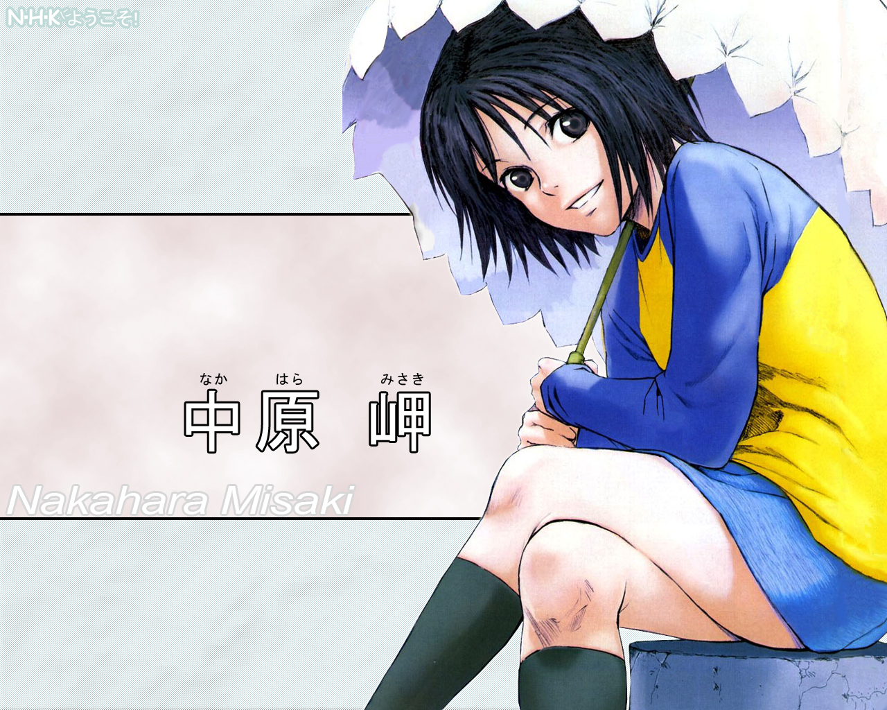 Description: A woman sitting on a stool with an umbrella over her head and a message written in chinese on the wall.