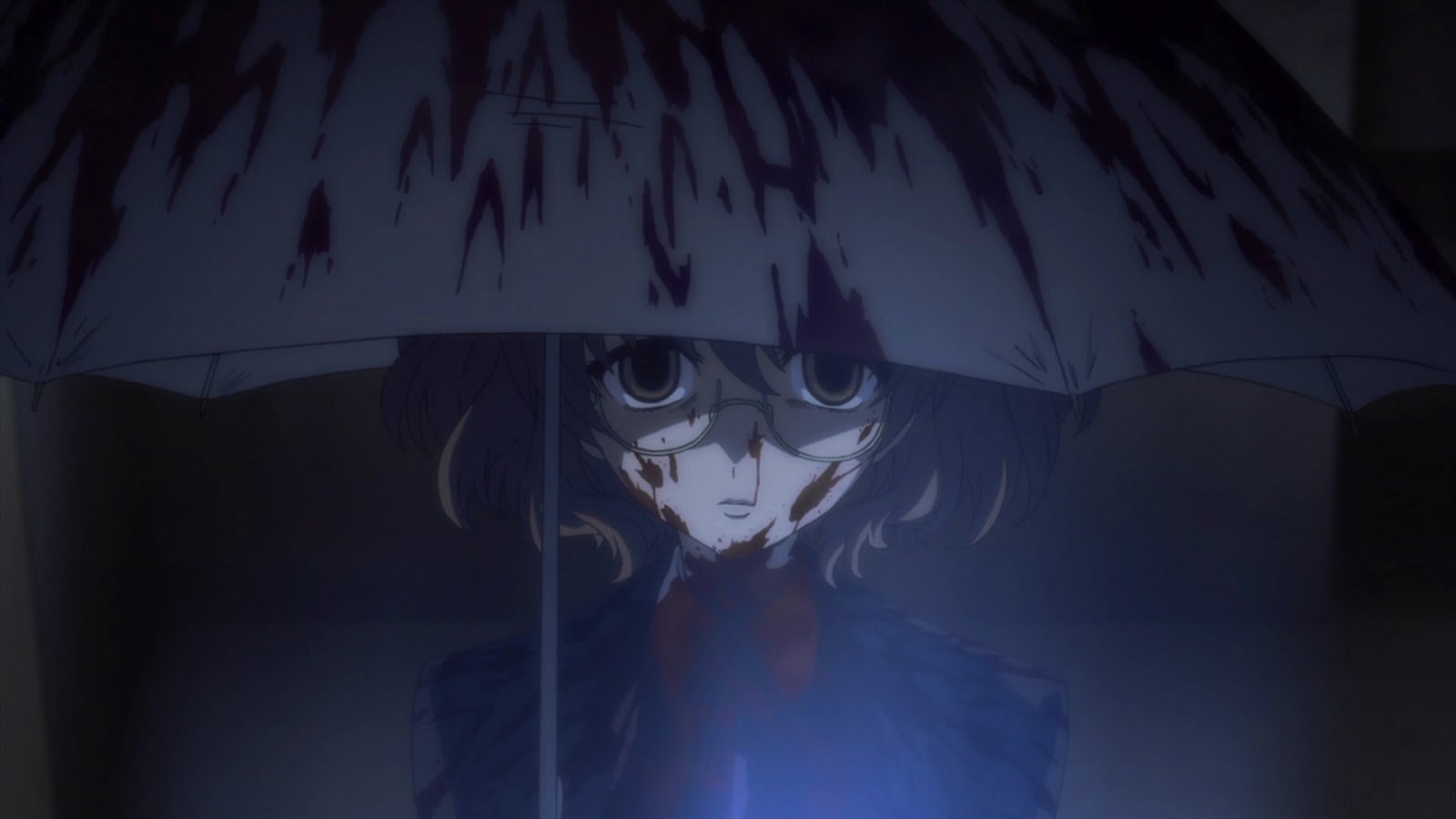 Description: A woman holding an umbrella in a dark room with a light shining on her face and a bloody umbrella.