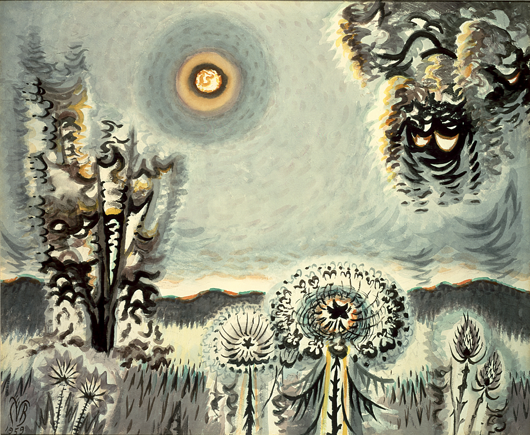 Description: A painting of a woman with a large umbrella in a field of trees and bushes with a full moon in the sky.
