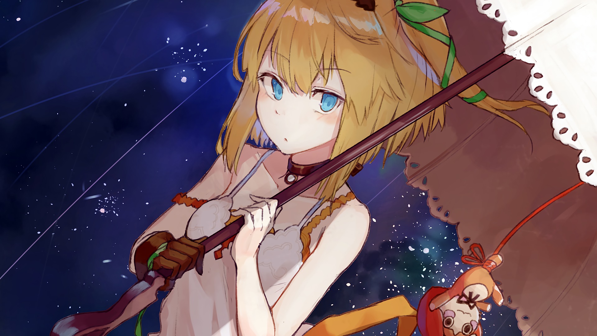 Description: A woman holding an umbrella in the rain with a monkey on the ground behind her and a cat on the ground.