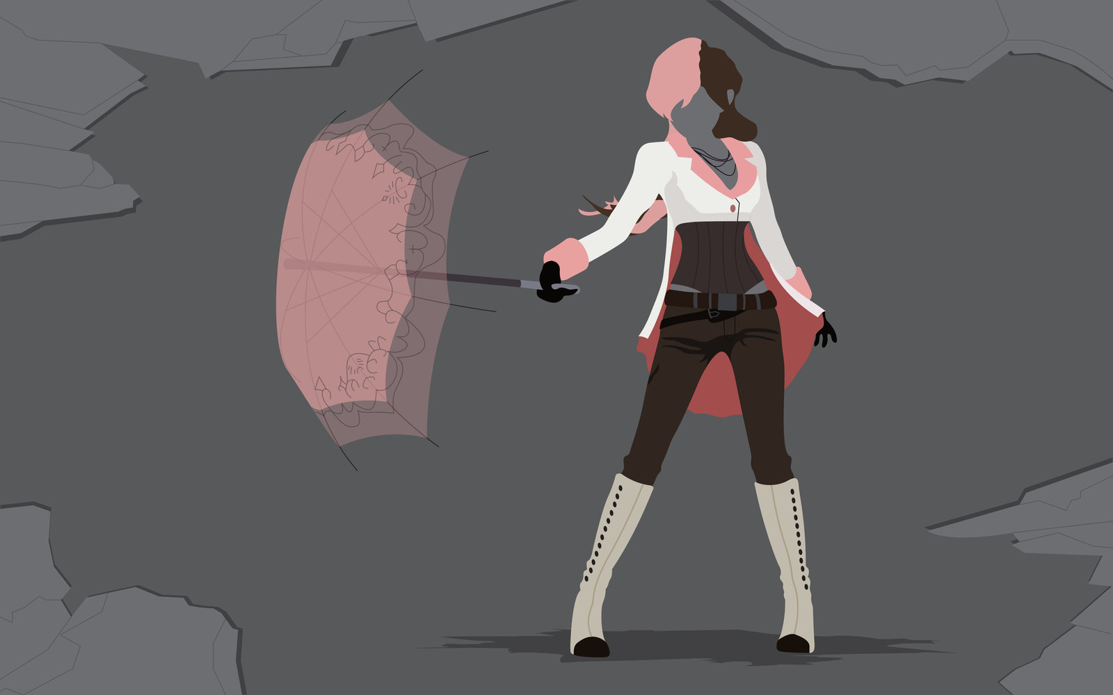 Description: A woman holding an umbrella in front of a rock wall with a pink umbrella in the background and a black and white umbrella.